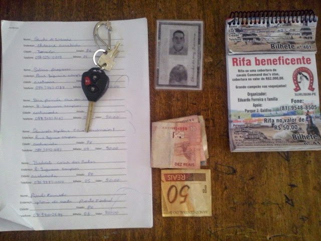 No inicio da noite desta quinta feira, enquanto a Guarnição Tática da Policia Militar de Carnaíba composta pelo Cabo Lima e SD Ericksson realizava rondas, foi surpreendida por uma pessoa a qual ofereceu uma rifa ao SD Ericksson, que segundo o acusado custava o valor de R$ 50,00 (cinquenta reais) e que seria revertido em beneficio a sua genitora que estaria com câncer.