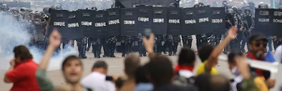 Às 16h, a polícia recebeu ordem para avançar sobre os manifestantes, que, em meio ao começo de conflito, tentaram ultrapassar a barreira humana feita pelos PMs para poder acompanhar a sessão. A polícia usou bombas de efeito moral, spray de pimenta, balas de borracha e gás lacrimogêneo, de acordo com os manifestantes. (Clique aqui e leia a matéria completa do G1 Paraná)