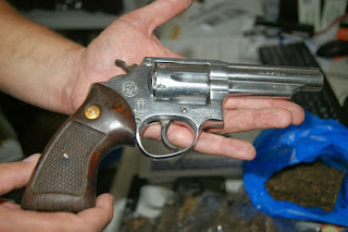 revólver apreendido também de calibre 32, marca COLT, oxidado, de quatro