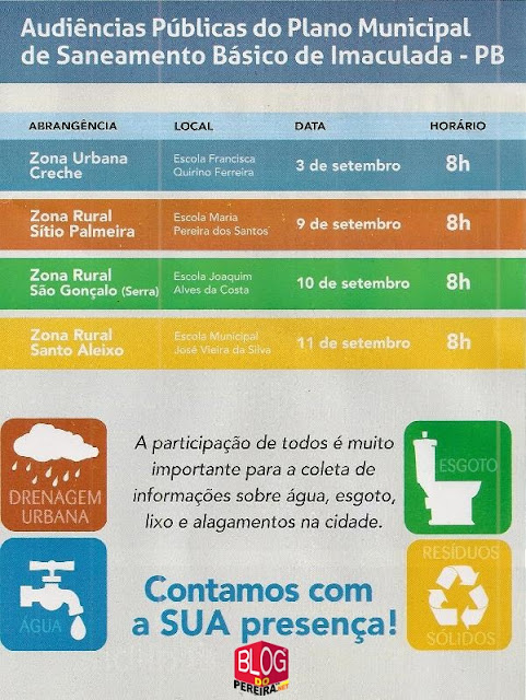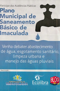 A Administração Municipal de Imaculada-PB realizará Audiências Públicas nos dias 3 (na sede), 9 (no Povoado de Palmeira), 10 (no Sítio São Gonçalo) e 11 (em Santo Aleixo) do mês de setembro para discutir o Plano Municipal de Saneamento Básico (PMSB). Nas Audiências vão se concentrar as atenções nos debates das metas para os próximos 25 anos de Imaculada nas áreas de Abastecimento d’água, esgotamento sanitário, limpeza urbana e manejo das águas pluviais segundo o secretário de Administração Jackson Caetano.