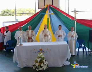 final da Caminhada Missionária aconteceu a celebração eucarística presidida pelo reverendíssimo Bispo Dom Egídio Bisol, e concelebrada pelos padres: Adhemar,