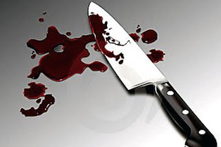 com uma arma branca, (tipo foice), e posteriormente com uma faca