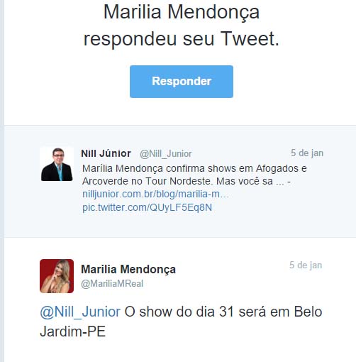 Twitter respondendo ao Blog de Nill JR Marília disse que o show do dia 31