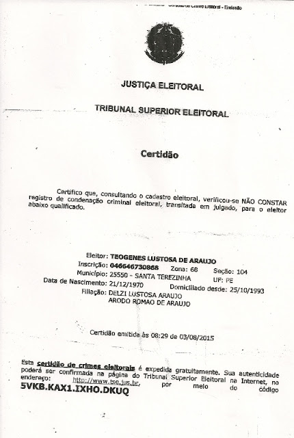 Militantes do ex-prefeito de Santa Terezinha Teógenes Lustosa estão espalhando cópias de uma Certidão de Crimes Eleitorais em vários pontos da cidade nesta segunda-feira 22.02. O fim da distribuição das cópias é para sanar dúvidas que muitos eleitores comentavam e se perguntavam se Teógenes poderia ser candidato este ano ou não, já que o mesmo teve suas contas rejeitadas pelo TCE e também pela Câmara de Vereadores e diziam que o mesmo estaria inelegível.