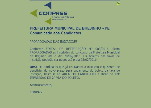 As inscrições do Concurso Público com 158 vagas pra provimento de cargos efetivos do município de Brejinho-PE só poderão ser feitas até o dia de hoje, 24 de fevereiro de 2016, pelo site www.conpass.com.br. As taxas de participação são de R$ 60,00 e R$ 100,00.