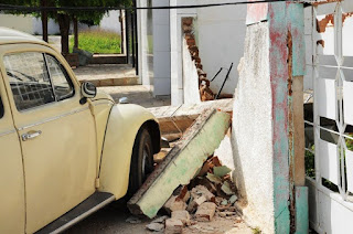 muro parcialmente destruído quando da queda de um dos postes, o veículo