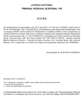 registrou na última 6ª feira (15) a pesquisa eleitoral. Segundo informações a pesquisa será