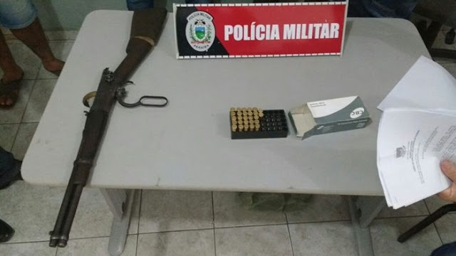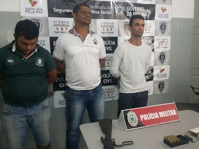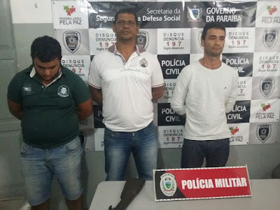 SOUSA (a esquerda da foto), NORMAELIO DE LIMA RODRIGUES (no centro da foto) E JOSE INACIO RODRIGUES DE LIMA (lado direito da foto). Em poder de INACIO foi apreendido um rifle calibre 44, além de diversas munições. Essa ação policial teve início após