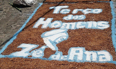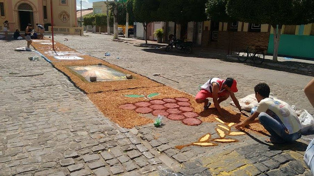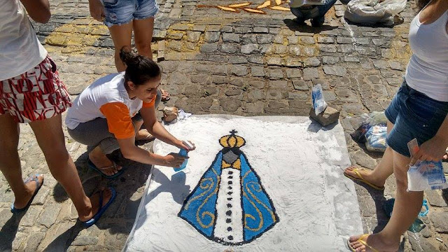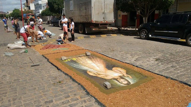 tradicional tapete, destacando imagens que marcam os rituais católicos