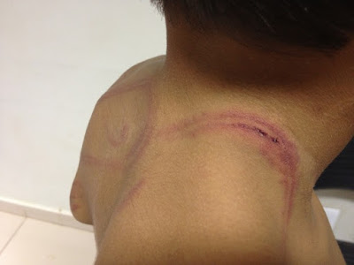 crianças com um fio de energia, deixando marcas da agressão no corpo das
