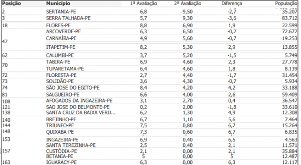 nota 5,60, Itapetim com nota 5,30, Calumbi (52º), com nota 5,20, Tabira e
