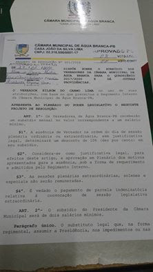 poder legislativo de Água Branca e foi aprovada por unanimidade pelos