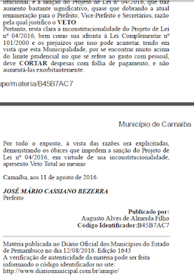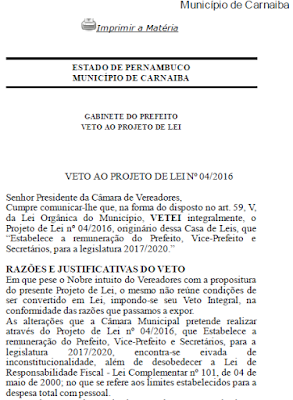 de Lei nº 04 de 2016. O veto foi inclusive publicado no Diario da