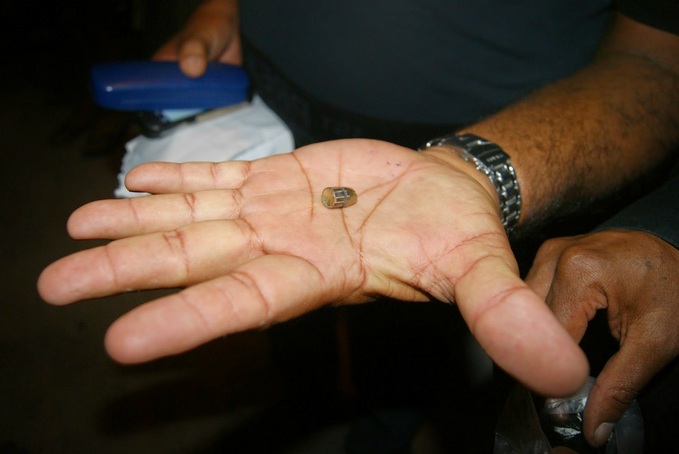 uma no pé direito, outra no braço esquerdo e outra no tórax. Apesar das