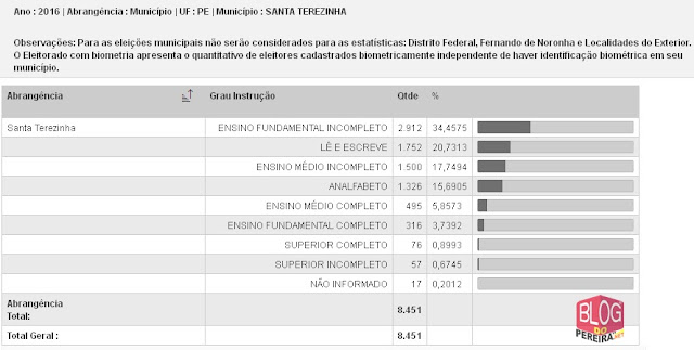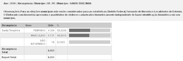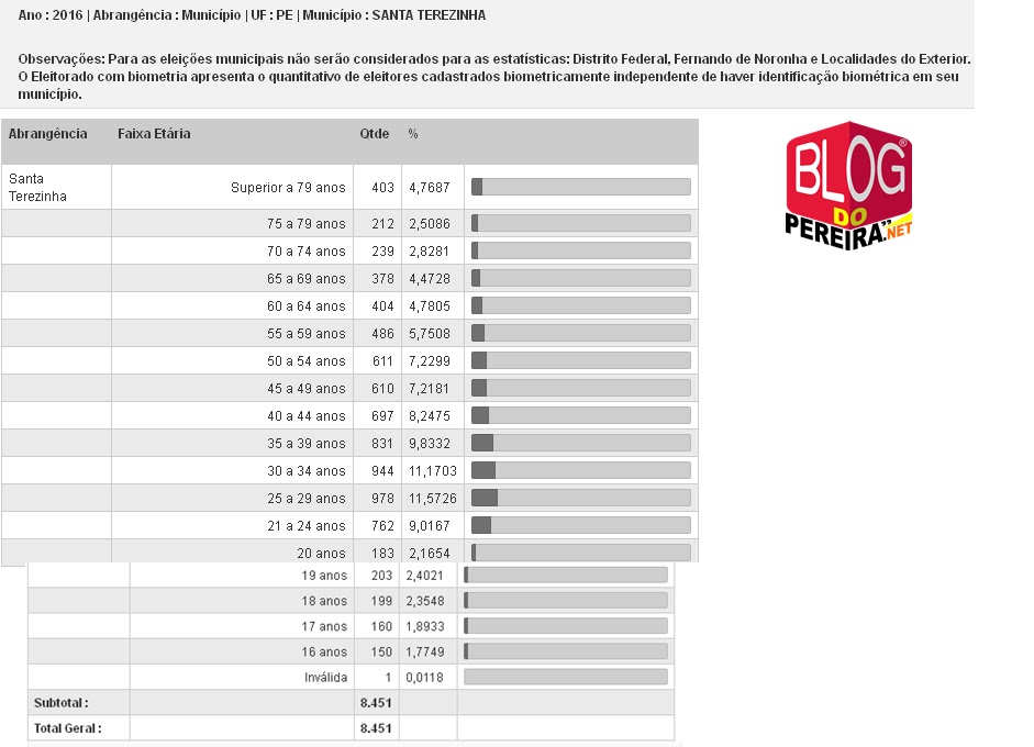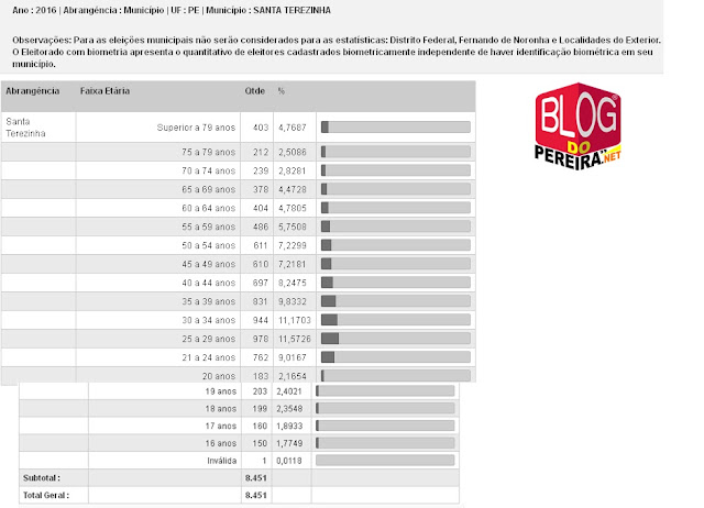 Em levantamento feito pelo Blog do Pereira.Net junto ao TRE-PE Santa Terezinha tem hoje 8.451 (oito mil quatrocentos e cinquenta e um) eleitores aptos a votarem no dia 2 de outubro, nas eleições para prefeito, vice e vereador. O fechamento para cadastro de eleitores foi encerrado em 4 de maio e a ultima vez que os dados foram atualizados foi em 22 de julho do corrente ano e mostram que houve uma evolução do eleitorado do município entre  2008, quando tínhamos 8.027 (oito mil e vinte e sete) votantes, se registrando uma queda em 2014 e depois um aumento até os dias que se seguem com os números expressos à cima.