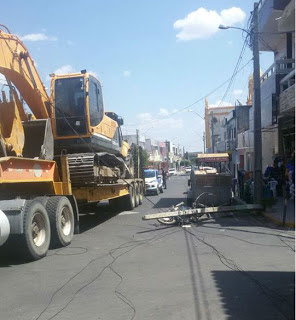 próximo a Loja Mega Modas, a retro escavadeira bateu em um cabo de aço