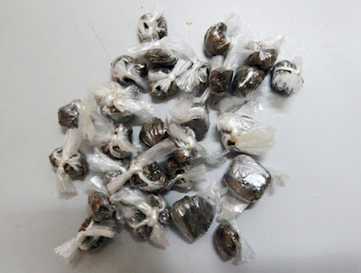 trouxas enroladas em uma sacola plástica no muro da residência, pesando