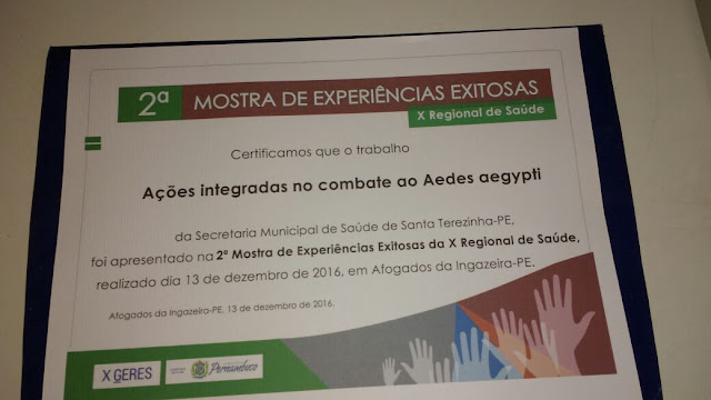 Santa Terezinha recebeu nesta terça-feira 13′ o Certificado das Experiências Exitosas nos trabalhos de combate ao Aedes aegypti apresentadas na X Regional de Saúde de Afogados da Ingazeira. No evento o município recebeu destaque nas ações integradas onde os temas apresentados foram.