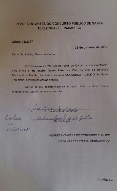 A comissão do concurso público feito ano passado pelo ex prefeito Delson Lustosa de Santa Terezinha solicitou uma reunião com o atual prefeito Vanin de Danda para discutir a cerca do certame que não foi homologado ainda, onde a esperança dos candidatos aprovados é que o atual gestor faça as vezes. Os candidatos estão buscando uma posição de Vanin de Danda sobre o concurso e nesse primeiro passo o encontro deve ser amigável. Em entrevista a Rádio Cidade FM no mês passado o prefeito disse que iria analisar a situação depois da posse, mas que não teria como prometer a homologação, mas quem se sentir prejudicado poderá avaliar a possibilidade de entrar na Justiça para pedir a nomeação, somente possível depois da homologação. O encontro será na próxima quarta-feira, 11 de janeiro às 10hrs da manhã na sede da prefeitura municipal.