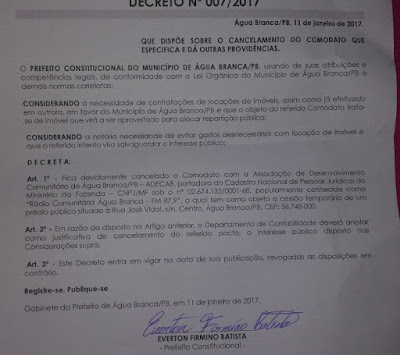 A Rádio Comunitária de Água Branca-PB recebeu nesta quarta feira, 11′ duas notificações da Prefeitura do município.