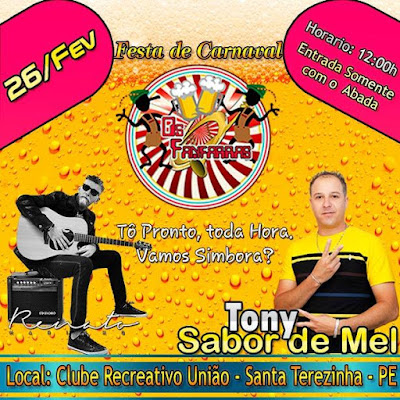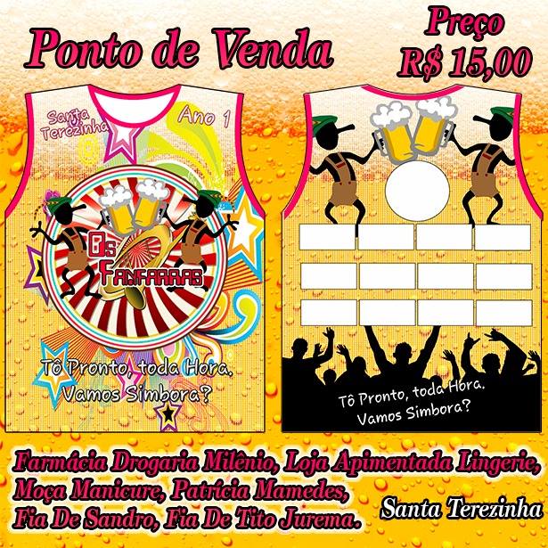 Chegando aí o Carnaval e o Bloco Os Fanfarras de Santa Terezinha, em seu primeiro ano, chegam com tudo para animar a Terrinha Santa com muita alegria. O bloco já colocou a camisa à venda e no dia 26 de fevereiro fará uma festa de Carnaval no Clube Recreativo União com duas atrações, Renato e Sabor de Mel. Durante todo o evento teremos banho de bica, a entrada é a camisa e o abadá. O bloco também planeja um passeio pelas ruas da cidade para relembrar os antigos carnavais vividos aqui, e que emplacam na saudade. Os interessados em participar do bloco devem procurar um dos pontos de venda e comprar a camisa, mas corra, o número de participantes é limitado.