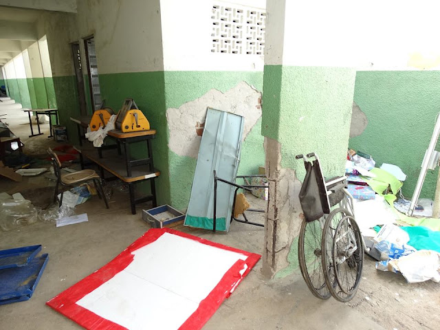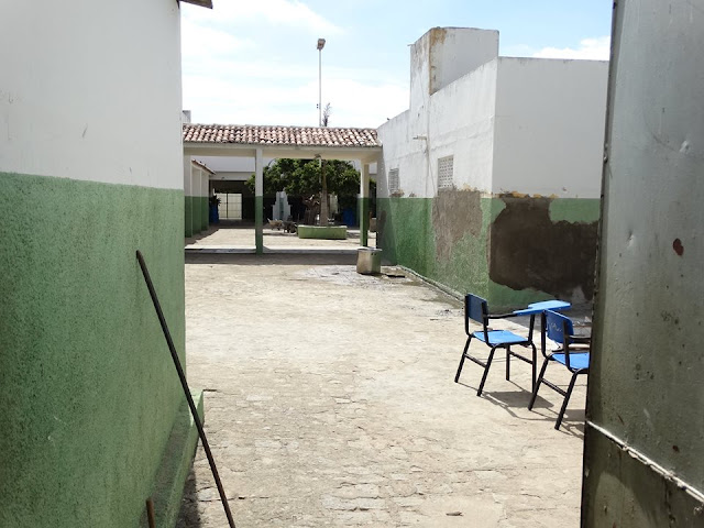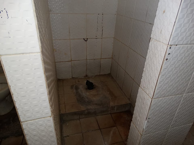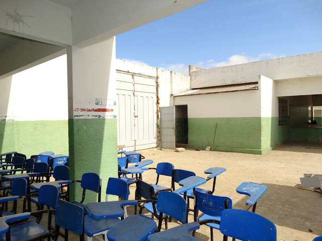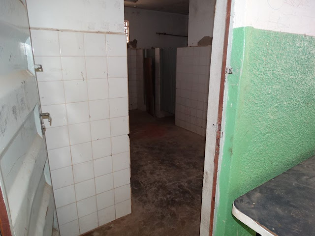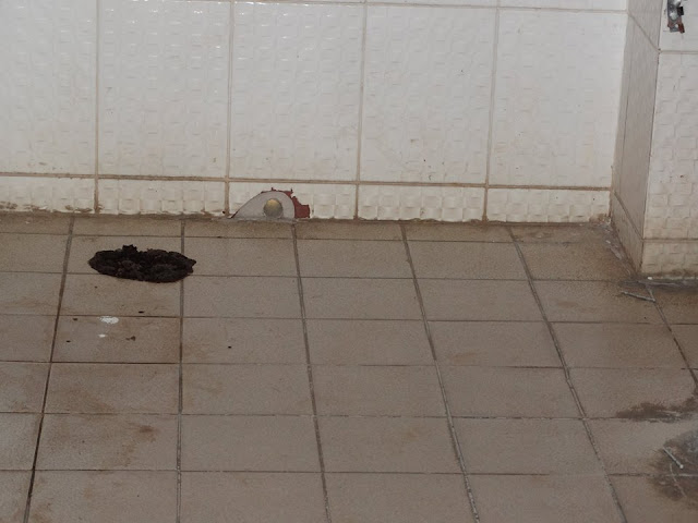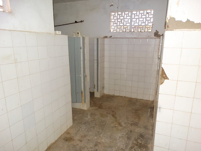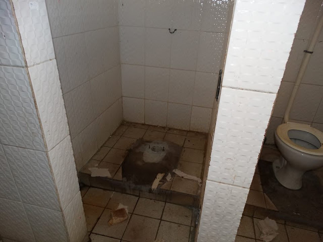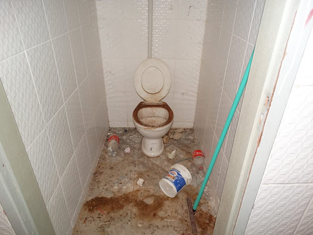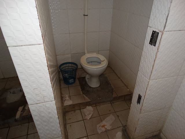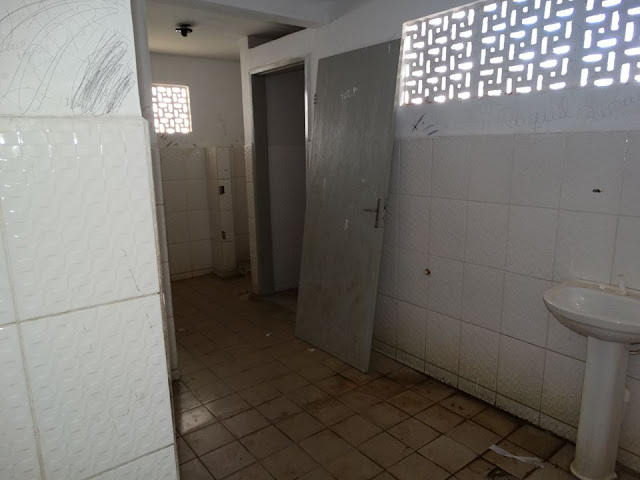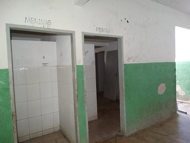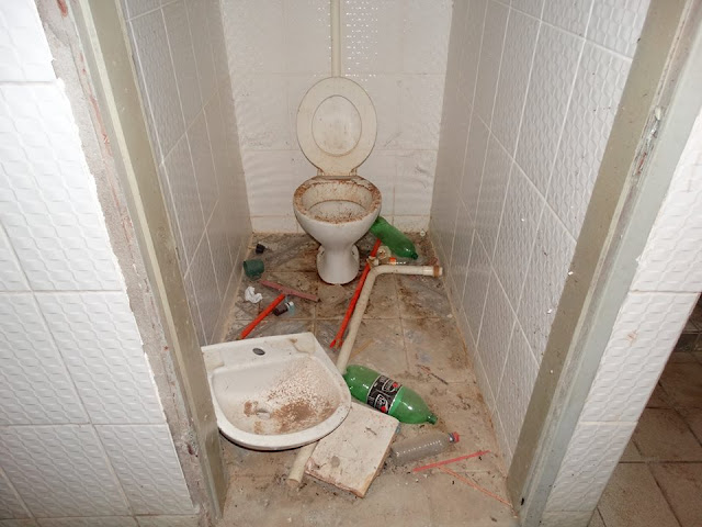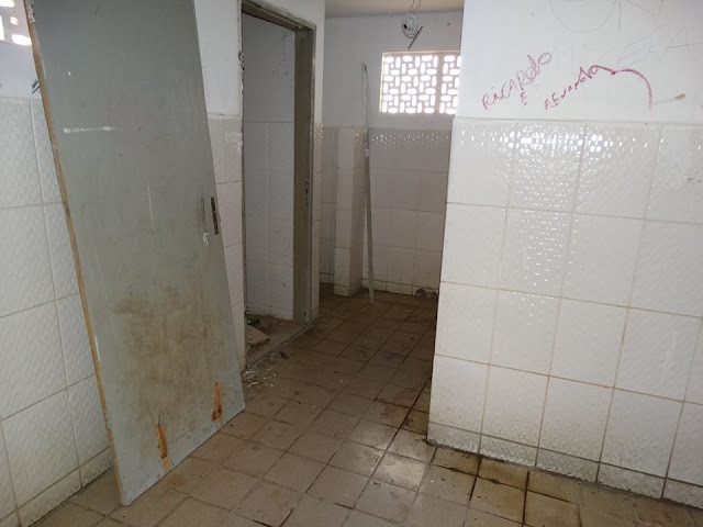 Banheiros com vasos quebrados, carteiras e mesas também, portas arrancadas,