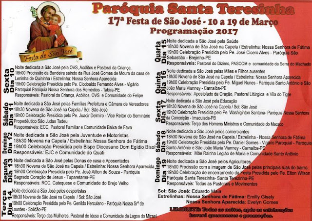 Começa na próxima sexta-feira 10′ a 17ª Festa de São José em Santa Terezinha. A abertura terá Procissão e a festa vai até o dia 19, dia do Santo das chuvas. Dom Egídio prestigiará o evento e presidirá a celebração da Santa Missa no domingo, dia 12. Dois dos três Padres Terezinenses participam da festa, padre Genildo Herculano na terça-feira dia 14 e padre Miguel Nunes na quinta-feira dia 16. A missa de encerramento será com o Pároco Elton Wilson.