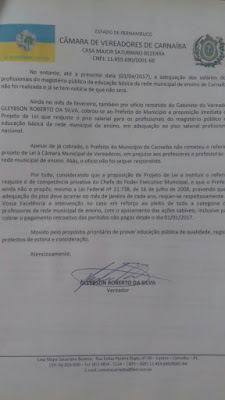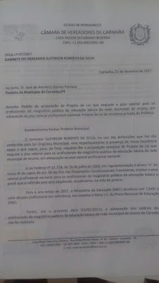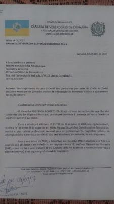 Carnaiba: Após ter pedido de Reajuste Salarial dos Professores negado pelo Prefeito, Vereador Gleybson Martins encaminha denuncia ao MP.