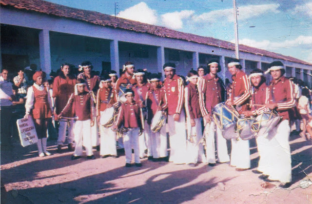 | Banda Marcial da EMJPS. Um dos integrantes é Amilton Lira (Mita). Ao fundo, o antigo prédio da escola. |