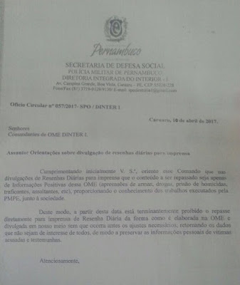 Comando da Polícia Militar de Pernambuco determina repasse apenas de informações “positivas” a imprensa.