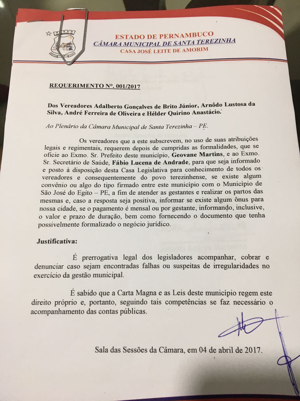 O vereador Adalberto JR, Doutor JR como é conhecido (a direita da foto), entrou em contato com o blog na noite desta quarta-feira 12′ informando que não foi o próprio André (a esquerda da foto, ao lado de Valério) quem enviou a nota ao meio de comunicação; que o mesmo estava viajando e que ele assinou sim o requerimento pedindo explicações de quanto tava sendo gasto para atender as gestantes. Disse que eles não são contra as gestantes serem atendidas na maternidade de São José do Egito, ou em qualquer outro hospital, e mais “somos favoráveis, porém como fomos investidos na função de vereador nós temos a obrigação de fiscalizar, e agente quer saber do prefeito quanto é que estamos gastando por isso, ou se isso é de graça”, pontuou.