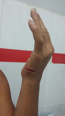 vítima veio a se ferir na mão esquerda com um pegador de macarrão.