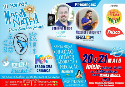 No mês de maio próximo a Paróquia de Santa Terezinha promoverá o 3º Kairós Maranathá, Vem Senhor Jesus. Dias 20 e 21 do mês Mariano a Escola José Paulino de Siqueira será mais uma vez o berço para celebração de Santa Missa, Louvores e pregações, com a participação de Danilo Gesualdo e Alexandra Gonçalves, ambos pregadores da Canção Nova de Cachoeira Paulista-SP. A Comunidade Católica Shalom de Patos também fará participação. A entrada do evento é franca, almoço, jantar e lanche estarão a venda no local. Para as crianças teremos novamente o Kairós Kids. Maiores informações nos telefones divulgados no cartaz.