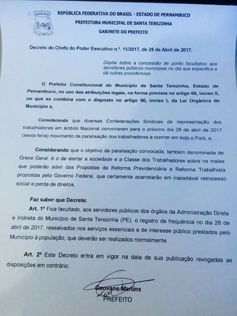 Trabalhistas e Previdenciários. O gestor reconhece que os trabalhadores têm o direito de defender seus direitos e que, greve é prevista na Constituição Federal. Os serviços essenciais e de interesse público estão mantidos.