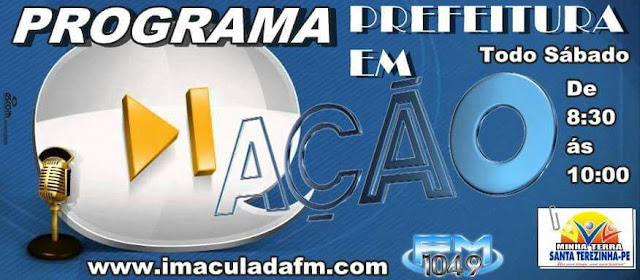 Com o objetivo de prestar esclarecimentos à população, é que a Prefeitura Municipal de Santa Terezinha nos seus 100 dias de Governo lançou no último sábado dia (08) no Auditório da E.M.E.F José Paulino de Siqueira o Programa Institucional “Prefeitura em Ação” o qual será veiculado na Rádio “IMACULADA FM” da cidade de Imaculada, todo sábado de 8:30 ás 10:00.Com duração de uma hora e meia. A redação do programa é de Valmir Andrade e apresentação dos radialistas Adarivan Santos e Valmir Andrade.