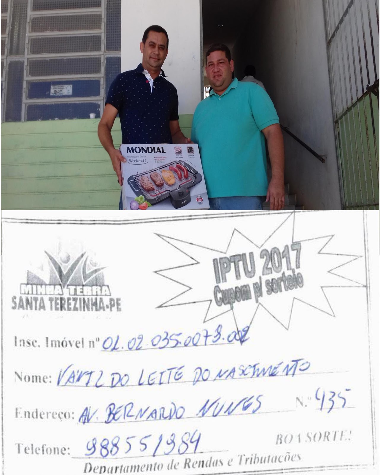 A Prefeitura de Santa Terezinha realizou na manhã desta terça-feira 16.05 o sorteio dos prêmios para aqueles contribuintes que pagaram seus carnês do IPTU 2017 e depositaram os comprovantes na urna. O sorteio foi realizado na frente do prédio da prefeitura e três sortudos levaram os três prêmios sorteados. Um Micro-ondas, uma Churrasqueira elétrica e uma moto Shineray 50cc 0km. O Setor de Tributos informou que muitos cumpriram a obrigação com o imposto, mas que vários ainda precisam cumprir com a obrigação e ajudar o município em várias áreas como a saúde, educação, iluminação pública, calçamento etc.