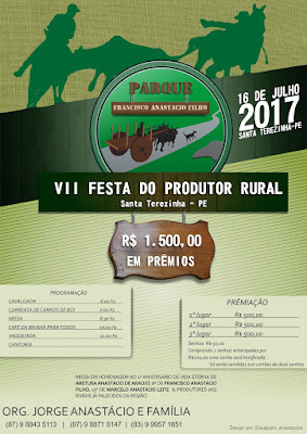 Neste domingo 16 de julho o professor Jorge Anastácio e família promovem a VI Festa do Produtor Rural no Parque Francisco Anastácio Filho, no Sítio Felipe em Santa Terezinha. A programação começa cedo às 6hrs da manhã com cavalgada, depois carreata de carros de boi, em seguida tem missa em homenagem a Aretuza Anastácio de Araújo, Francisco Anastácio Filho e Marcelo Anastácio Leite. Ainda tem café da manhã para todos e as 11hrs começa a vaquejada. Nesse evento tradição ainda teremos cantoria com os poetas Afonso Pequeno e Lázaro Pessoa, e depois muito forró pé de serra.