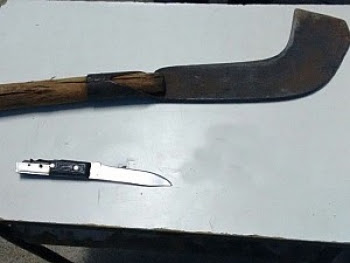 armado com uma faca, uma tesoura e uma foice, visivelmente transtornado e