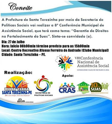 Por meio da Secretaria de Políticas Sociais nesta quinta-feira (27/07), a Prefeitura de Santa Terezinha vai realizar a 8ª Conferência Municipal de Assistência Social, que terá como tema: “Garantia de Direitos no Fortalecimento do Suas”.