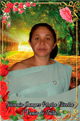 Neste domingo 06 de agosto estaremos unidos na Igreja Matriz de Santa Terezinha às 8hrs da manhã para rezar e lembrar um (1) ano de saudades da inesquecível Gilvania Campos Pereira Oliveira (Vânia de Tuita). Convidados parentes amigos e o povo em geral para participar desse momento cristão de renovação da esperança e da fé na ressurreição de Cristo. Para nós da família é sempre um prazer rever e abraças os amigos e pedimos que lembrem dela em suas orações e peçam a Deus paz e luz em seu caminho.