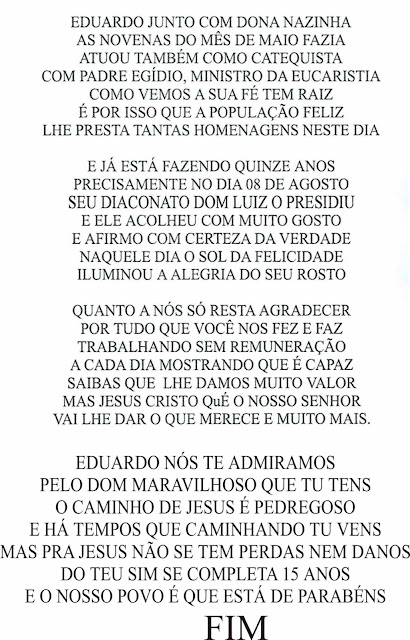 Veja os versos de homenagem aos 15 anos de Diaconato de Eduardo Oliveira feitos por Antonio de Nina. Notícias Por Blog do Pereira.Net Publicado em 5 de setembro de 2017 Ultima atualização 2 de fevereiro de 2022 0 255 Compartilhado aniversárioDestaquesDiaconatoEduardo OliveiraIgreja CatólicaSanta Terezinha 0 255 Compartilhado FacebookWhatsAppTelegram