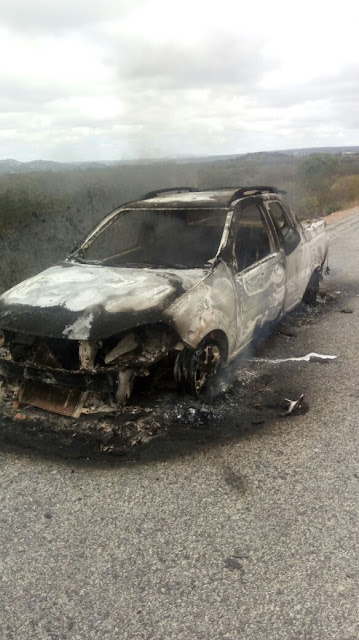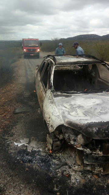 | Os bandidos atearam fogo em um carro, na fuga. |