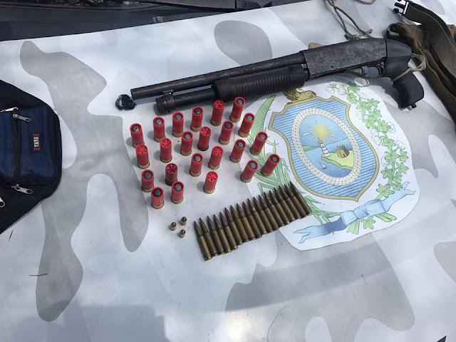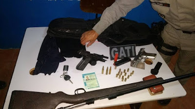 .40, um fuzil calibre 7.62, dois capuzes, dois coletes balísticos, além