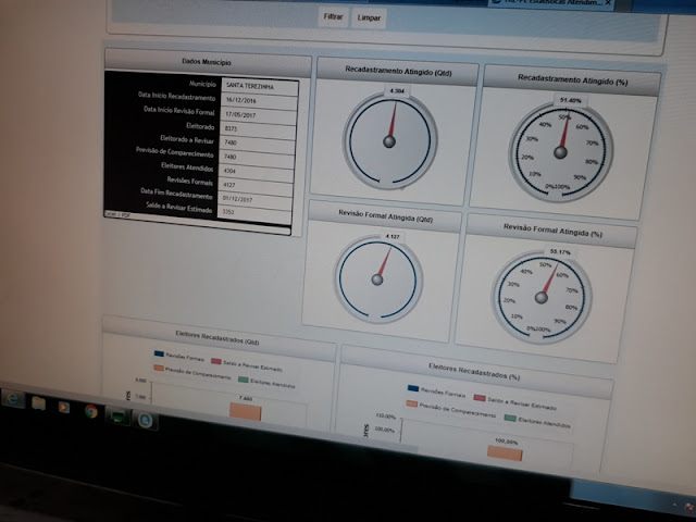 Pouco mais da metade do eleitorado Terezinhense compareceu ao Posto de Atendimento Biométrico para fazer o recadastramento. Santa Terezinha tem 8.373 votantes, destes 7.480 estão sendo convocados para passar pela biometria, que já vale a partir da eleição do ano que vem. Em consulta feita pelo blog nesta sexta-feira 13.10 ao posto, que gentilmente cedeu os números para divulgação, até o momento entre recadastros e novos títulos já foram 4.304 pessoas, um percentual de 55,17%, ainda faltam 3.353.