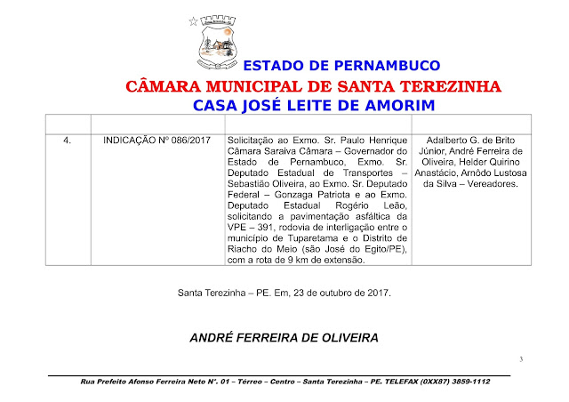 Já a vereadora Lanjinha de Teógenes solicita que seja pavimentada a frente da Igreja de São José. Ainda teremos a concessão do Titulo de cidadão honorário à pessoa do empresário Agostinho, da Natália Calçados.