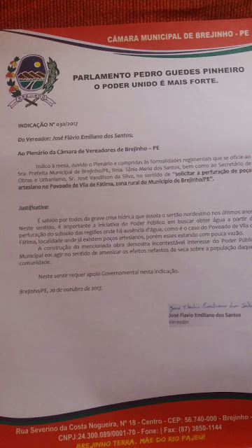 Os Vereadores Neném da Foveira e Flavinho Emiliano, filho de Damião Emiliano, três vezes vereador em Brejinho, se juntaram pela mesma causa, para trabalhar unidos para trazer benefícios para Vila de Fátima, Lagoinha e Brejinho. Ambos vereadores estão muito animados com a nova parceria que promete render frutos para a população do município. Na sessão desta quarta-feira Flavinho Emiliano teve uma indicação aprovada pelo Legislativo, onde o mesmo pede ao executivo municipal a perfuração de poço artesiano no Povoado de Vila de Fátima, visto que devido a crise d’água, a localidade passa por dificuldades, já que os poços que existem na comunidade estão com pouca vazão, e essa ação poderá amenizar o sofrimento do povo e os efeitos nefastos da seca.