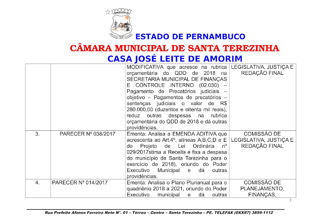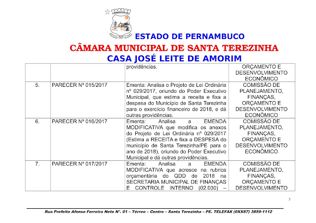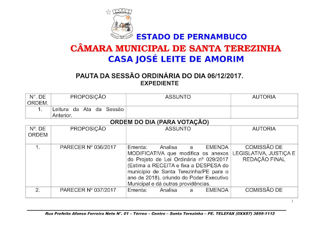 A Câmara de Vereadores de Santa Terezinha volta a se reunir em Sessão Ordinária na noite desta quarta-feira 06.12 para a última sessão do ano com pauta extensa que analisa várias emendas aditivas e modificativas. Será um momento também para refletir sobre o encerramento do 1º ano de trabalho desse legislativo que hora se entende, hora se desentende e o expediente da sessão de hoje está sendo bastante aguardado. Depois da última Sessão Ordinária de 2017, os vereadores só voltam a se reunir no dia 7 de fevereiro de 2018, ou seja, um recesso parlamentar de mais de dois meses.