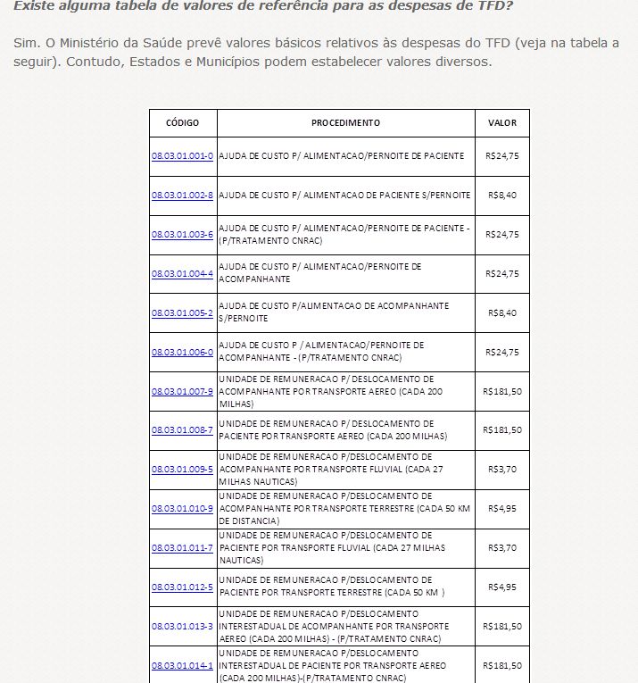 Tabela com as despesas que o TFD cobre; ou seja; os recursos a que se