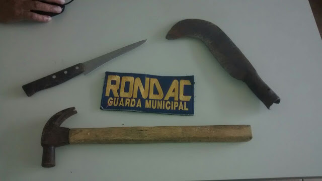 A Guarnição ao chegar no local, foi informado pela vítima que o imputado havia quebrado os vidros da porta da cozinha e adentrado na residência, informou ainda que o mesmo a ameaça a todo instante com uma faca peixeira, momento contínuo que a equipe entrou na residência, e usando dos meios moderados, imobilizou o acusado, apreendeu uma faca peixeira, uma foice e um martelo, ferramentas usadas para ameaçar a vítima. Todo material e imputado foram conduzidos para a DPC Local e passados para a autoridade competente.