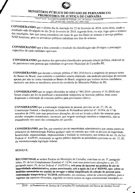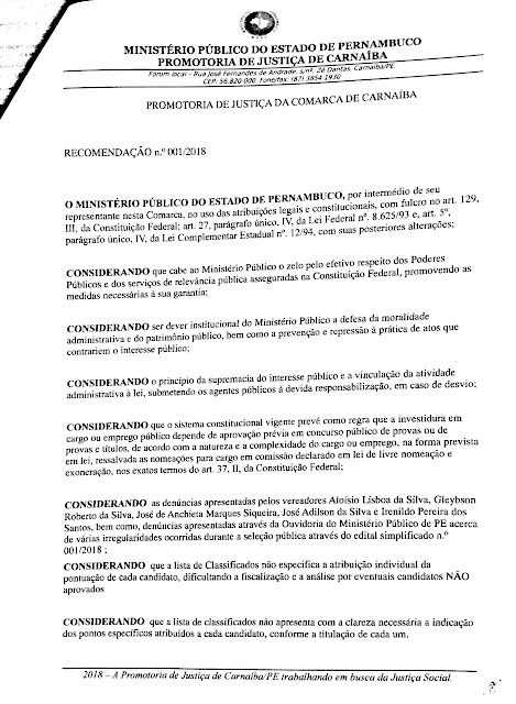 (foto) emitiu nesta quinta-feira (08) a Recomendação nº 001/2018 determinando ao
